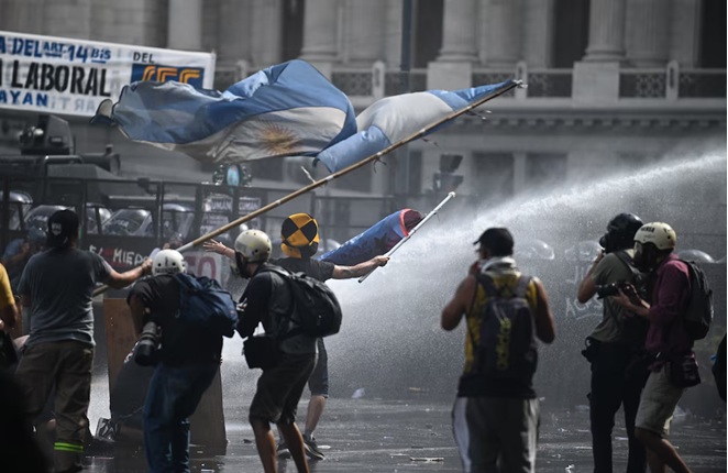 El mandatario acompañó la frase con imágenes y videos de los disturbios registrados en las inmediaciones del Palacio Legislativo. Durante la tarde y noche, manifestantes y fuerzas federales protagonizaron momentos de tensión, con corridas, uso de gases lacrimógenos, balas de goma y carros hidrantes. El operativo se desplegó bajo el protocolo antipiquete, con el objetivo —según el Gobierno— de garantizar el funcionamiento del Congreso y el acceso de los legisladores al recinto.