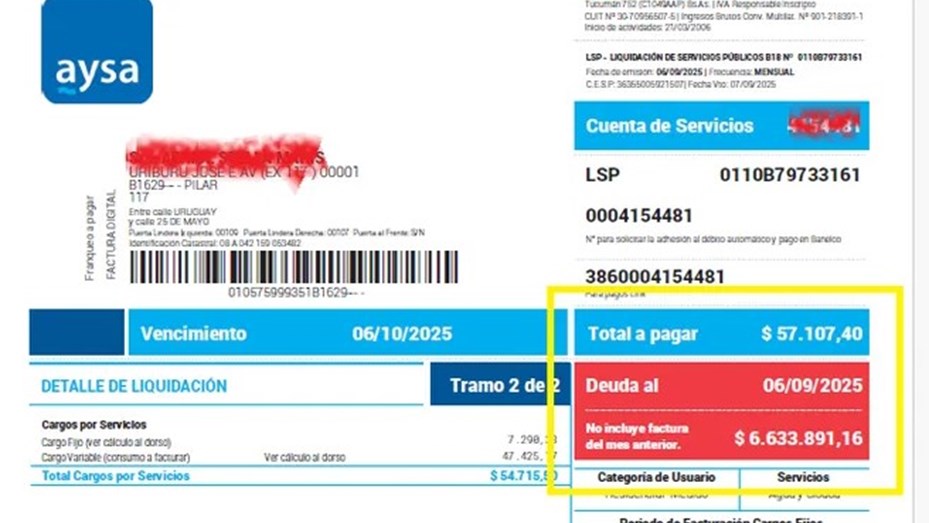 Una familia de Pilar vivió una verdadera odisea al recibir la factura de agua más elevada registrada en la zona: más de $6,6 millones en una boleta emitida por Aysa.