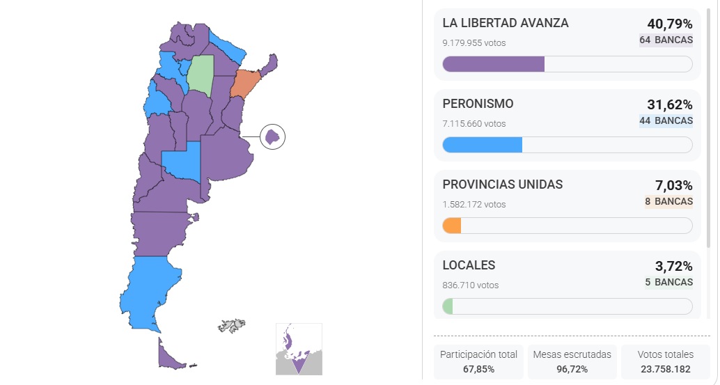 El oficialismo ganó en 16 provincias, entre ellas Buenos Aires, CABA, Córdoba, Santa Fe, Mendoza, Neuquén, Salta y Misiones. Fuerza Patria y sellos aliados se impusieron en seis distritos: Catamarca, Formosa, La Pampa, San Juan, Santa Cruz y Tucumán.