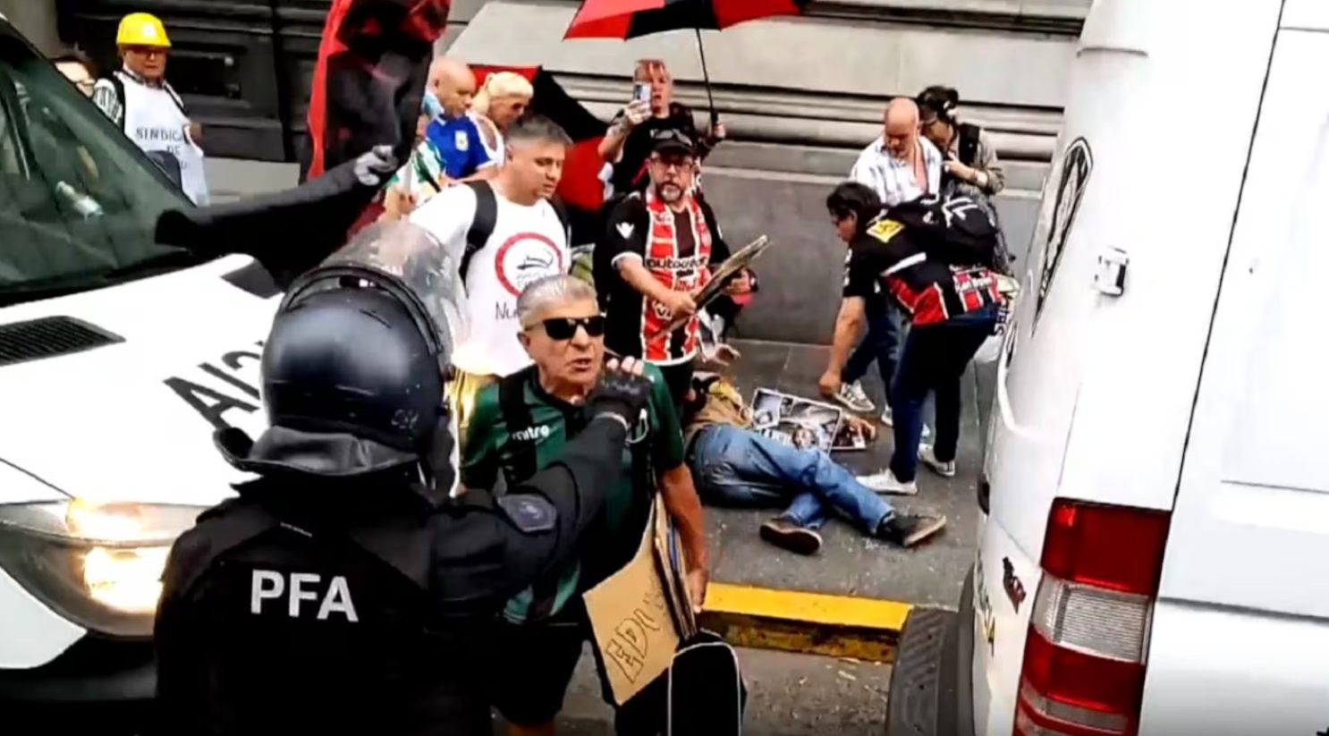 El operativo incluyó un amplio despliegue de efectivos y la colocación de vallas sobre la avenida Rivadavia para limitar la circulación, manteniendo a los manifestantes detrás de las barreras móviles. La tensión se intensificó sobre la avenida Hipólito Yrigoyen, cuando un hombre mayor fue empujado por un policía al intentar bajar a la calle, provocando que cayera al suelo y generando forcejeos momentáneos.